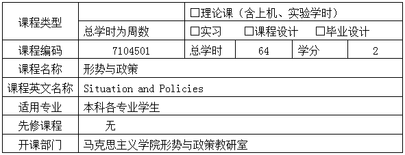形势与政策课是全校本科各专业学生的必修课;是帮助大学生正确认识新时代国内外形势,深刻领会党的十八大以来党和国家事业取得的历史性成就、发生的历史性变革、面临的历史性机遇和挑战的核心课程;是第一时间推动党的理论创新成果进教材进课堂进学生头脑,引导大学生准确理解党的基本理论、基本路线、基本方略的重要渠道;是高校思想政治理论课的重要组成部分,是对学生进行形势与政策教育的主渠道、主阵地。