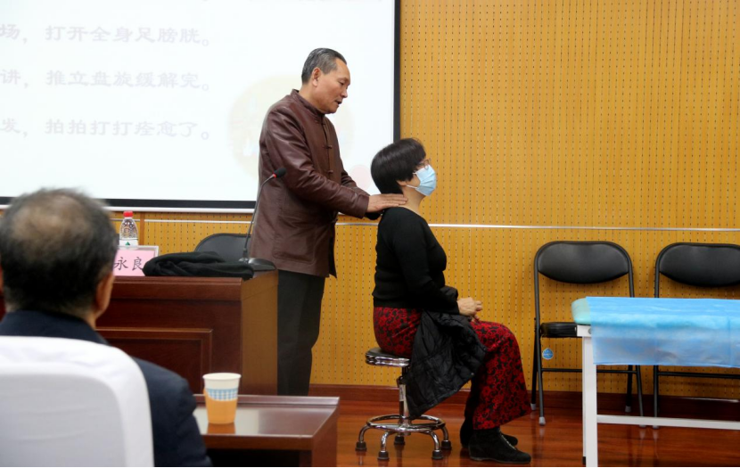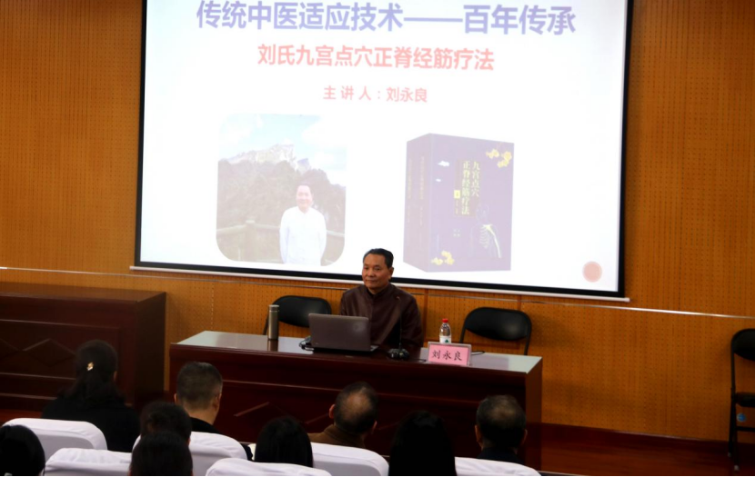在第一学术报告厅刘永良教授为医学院师生作了一场题为《刘氏九宫点穴正脊经筋疗法》的学术报告。刘教授主要从中医急救、常见疾病简易治疗经验和九宫点穴正脊经筋疗法三部分进行分享。刘教授讲课生动活泼,干货满满,并润物细无声的融入了课程思政的内容,老师与同学们积极录像、做笔记,收获颇丰。在实际操作的现场演示环节,刘永良教授主要讲解了颈椎病、肩周炎、落枕和关节脱位等日常生活中常见疾病的治疗手法,引导学生实践运用。讲座结束时师生仍意犹未尽,热情提问请教,作为我校客座教授,期待刘永良教授今后为师生带来更多精彩讲座和专业指导!