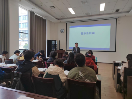 医学院一行首先听取了21临床医学2班《内科学》课程的课堂教学。该课程由第一附属医院主任医师、消化内科副主任米彩锋主讲,米主任通过生动的临床案例讲解了病毒性肝炎发病机制及临床诊断治疗方法,使学生们对病毒性肝炎的基本理论和临床实践有了深刻的理解。医学院领导及督导组成员认真聆听,对米主任的教学方法和课堂管理给予了高度评价。
