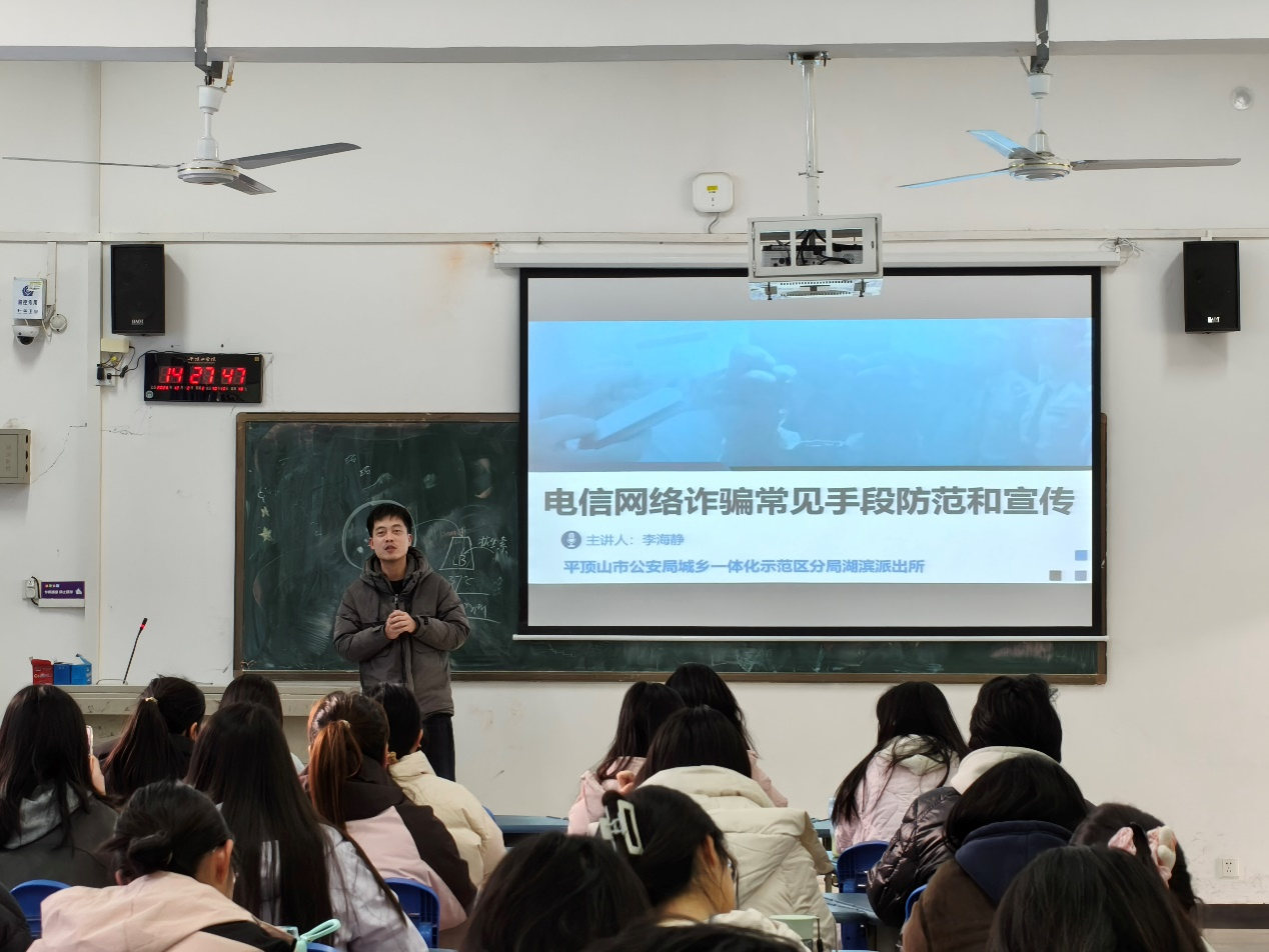为有效防范网络电信诈骗,12月2日下午,我院联合学校保卫处,特邀示范区分局湖滨派出所民警李海静来院为学生举办反电信诈骗教育讲座。