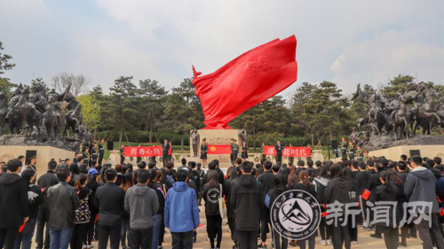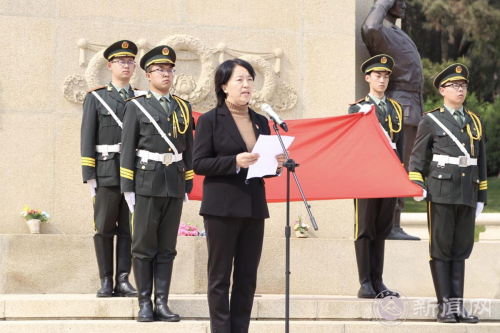 活动在高唱的国歌声中开始。伴着庄严肃穆的献花曲,学生代表向革命先辈敬献花篮,校党委副书记田红芳上前整理花篮缎带。