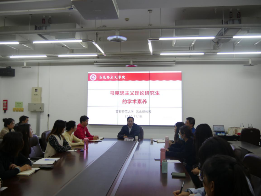11月18日下午,我院特邀首都师范大学公海官方网710jcjc副院长、北京高校中国特色社会主义理论研究协同创新中心(首都师范大学)常务副主任、北京市伦理学会副秘书长、首都师范大学社会文化史研究中心研究员、北京市委讲师团宣讲专家沈永福教授,在瀚学楼1208会议室主讲题为《马克思主义理论研究生的学术素养》的学术报告,我院全体研究生到场聆听,报告由我院副院长张茂林主持。
