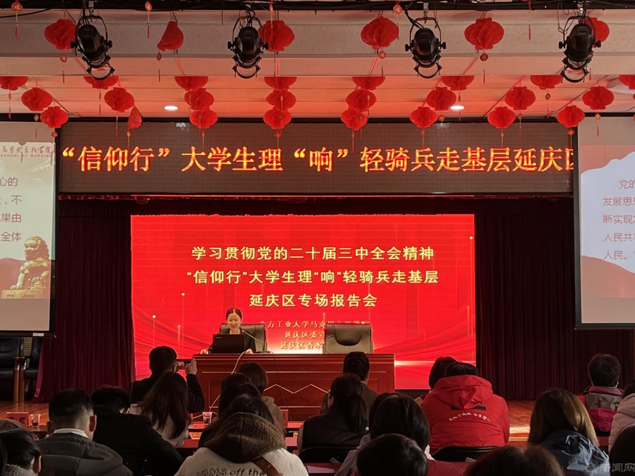 为进一步凝聚思想共识、筑牢理论根基,推动党的二十届三中全会精神紧贴实际、深入人心,10月24日,公海官方网710jcjc师生宣讲团一行赴延庆区,开展“信仰行”大学生理“响”轻骑兵走基层活动。师生们分别来到延庆镇、旧县镇和香水园街道,开展党的二十届三中全会精神专题宣讲。二百余名党员代表、群众代表参加报告会。宣讲活动受到当地党员群众的普遍好评。