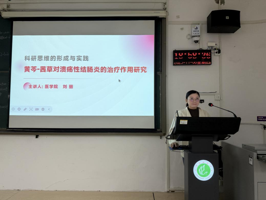 刘丽老师以“科研思维的形成与实践——以黄芩-茜草治疗溃疡性结肠炎研究为例”为题作专题报告。她从临床痛点与现实需求切入,阐述科研问题的提出路径,并结合网络药理学、分子对接及动物实验的实例,展示了科研从假设到验证的完整逻辑链条,为大一新生打开了理解科研逻辑的第一扇门,帮助他们建立起初步的科研认知框架。