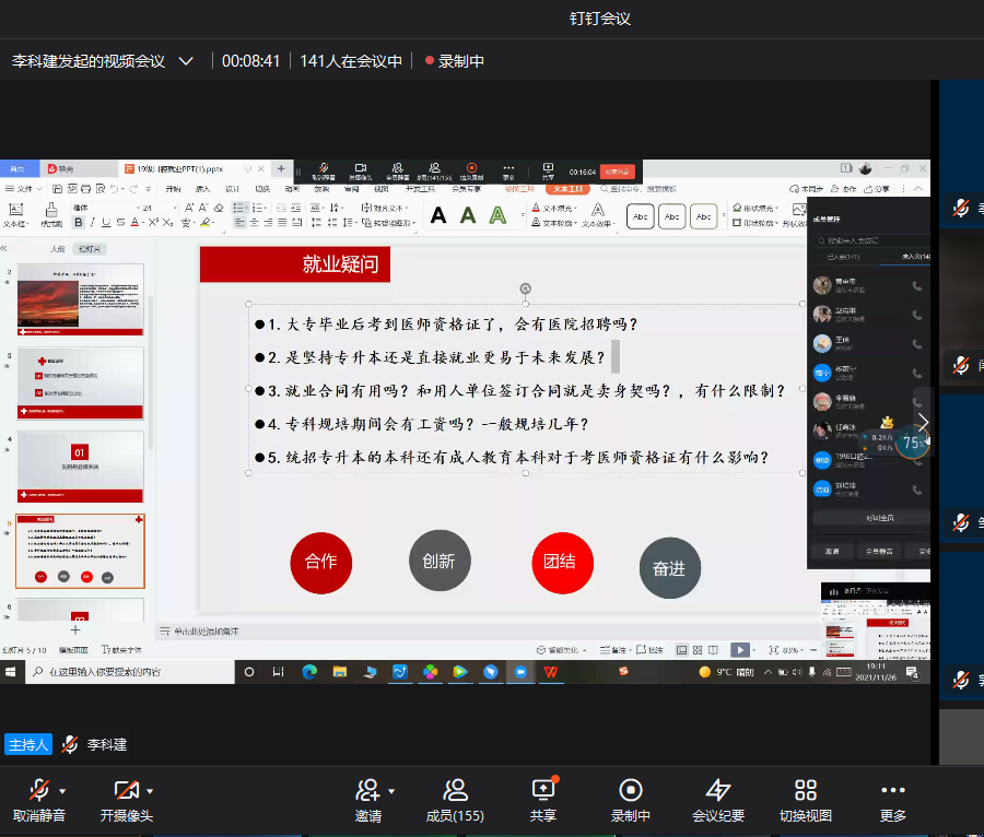 为提早部署、谋划、促进2022届毕业生就业工作,医学院于11月23-26日分专业以线上或线下的形式召开了2022届毕业生就业主题班会。院领导、辅导员、学业成长导师与2022届毕业生一起参加此次主题班会。