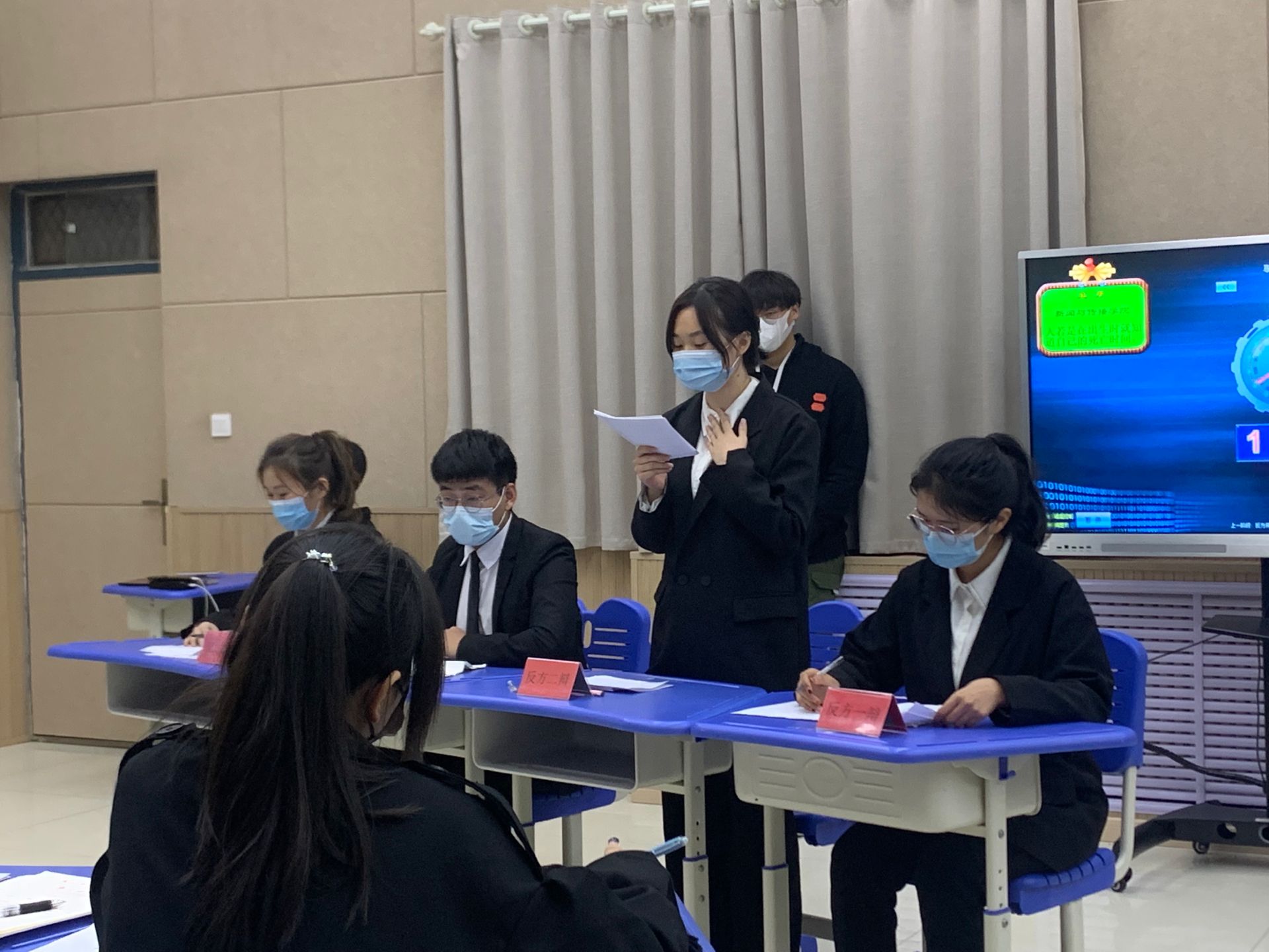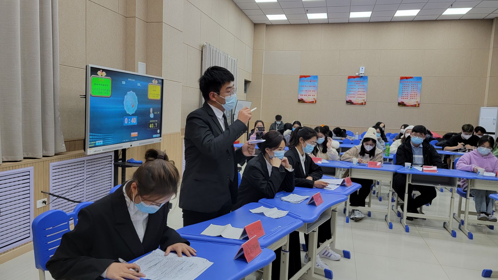 最后比赛进入总结陈词环节,双方辩手为比赛做出最后的努力。比赛结束后,双方有序离场,最终在这场角逐激烈的比赛中,医学院代表队荣获季军,医学院张梦薇同学获得“最佳辩手”荣誉称号。