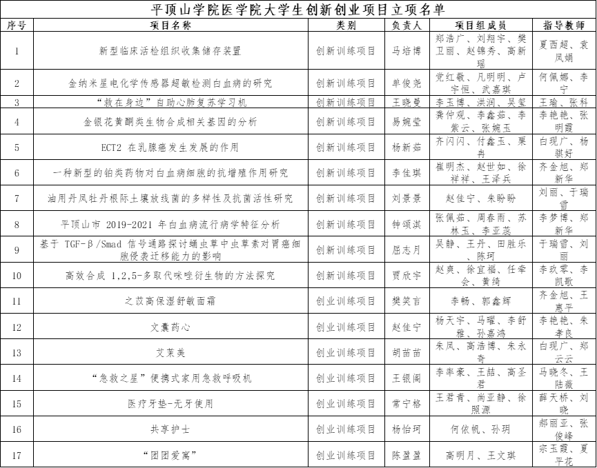 在刚刚公布的《2021年度平顶山学院大学生创新创业训练计划项目立项结果》中,全校共立项60项,其中医学院17个项目成功立项,立项数居全校首位,创我院历年新高。