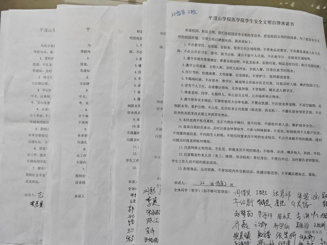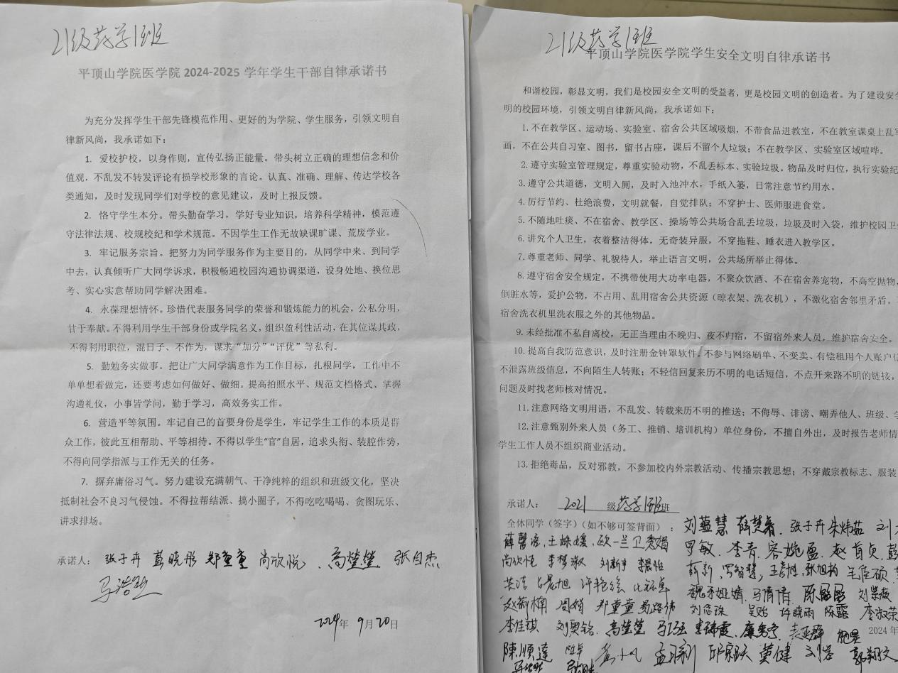 进入大学,树立起为自己行为负责的意识是大学生的第一节必修课。为创造文明平安校园,加强学生安全意识,提高校园、宿舍文明自律规范,医学院全体在校生在2024年9月20日签订了文明自律承诺书,全体学生干部签订了医学院2024-2025学年学生干部自律承诺书。