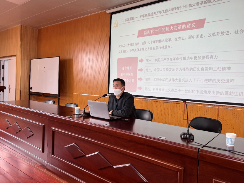 会上,王志浩博士以《建设社会主义现代化国家的政治宣言和政治纲领》为题,结合习近平总书记提出的“五个牢牢把握”,围绕把握党的二十大的重要意义和二十大的主题、牢牢把握过去5年工作和新时代10年伟大变革、牢牢把握习近平新时代中国特色社会主义思想的世界观和方法论、牢牢把握以中国式现代化推进中华民族伟大复兴的使命任务、牢牢把握以伟大自我革命引领伟大社会革命的重要要求、牢牢把握团结奋斗的时代要求等方面对党的二十大精神进行了全面系统地解读,让全体学生深刻领会到了党的二十大的精神内涵和指导作用。王志浩博士在总结中用习近平总书记的话勉励同学们,希望同学们在今后发展中能够不忘初心,脚踏实地,敢想敢干,坚定不移跟党走。