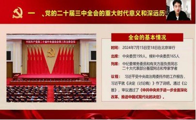 党的二十届三中全会是在以中国式现代化全面推进强国建设、民族复兴伟业的关键时期召开的一次十分重要的会议。为深刻学习领会党的二十届三中全会精神,平顶山学院医学院于2024年9月19日至9月27日开展了《深入学习贯彻党的二十届三中全会精神》专题宣讲。医学院党委书记王莉、党委副书记夏乐及辅导员老师采取线上线下相结合的方式开展共计15场宣讲讲座,覆盖医学院1800余名学子。