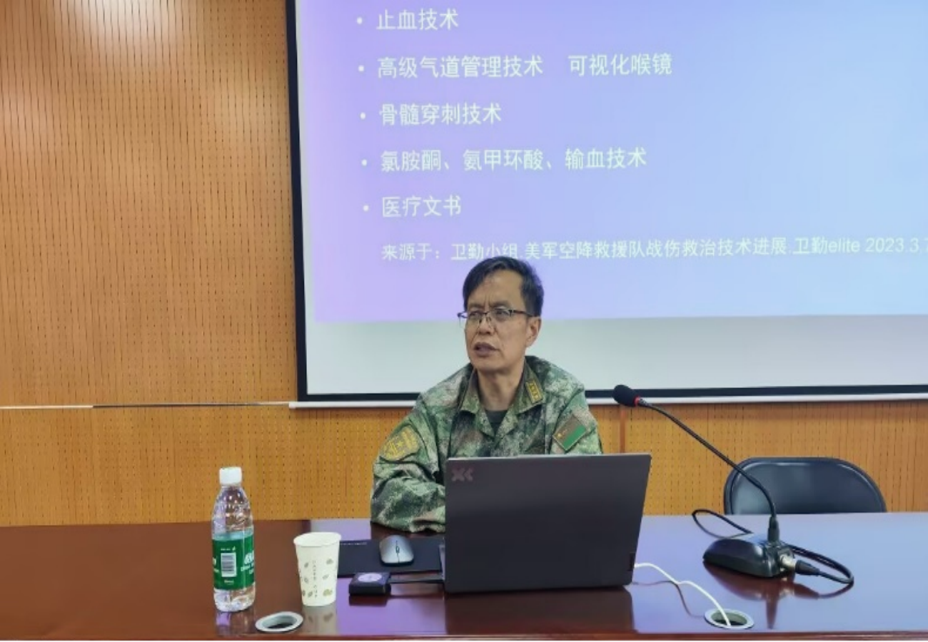 讲座伊始,袁跃彬主任以外军经典战例与俄乌冲突为切入点,深刻剖析现代战争“高技术对抗、高伤亡密度、无前后方界限”的新特征,强调“和平年代的卫勤准备是国家安全的隐性防线”。他对比外军卫勤力量构成,指出我国需重点提升伤员后送体系构建、战场生存能力及损伤控制手术等实战技能培训,并特别提及美军空降救援队战伤救治技术中的止血技术、高级气道管理等核心模块,为学院学科建设提供“平战结合”的发展思路。