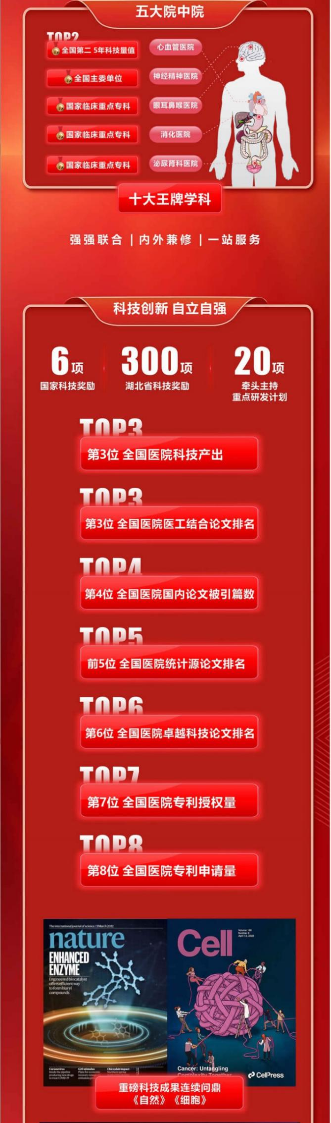 医院排名最高位列全国第7位。2022年度中国医院/中国医学院校科技量值(STEM)”排行榜中,科技产出排名全国医院第3名。最新《中国医院创新转化排行榜》上,医院荣获“全国进步最快榜单第1名”“专利授权量榜单第7名”“专利申请量榜单第8名”等多个全国前十奖项。