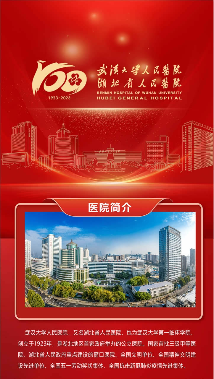 武汉大学人民医院(Renmin Hospital of Wuhan University),又名湖北省人民医院(Hubei General Hospital),也为武汉大学第一临床学院(The First Clinical Medical School of Wuhan University),由早期共产党人陈雨苍博士创立于1923年,迄今已有百年历史。